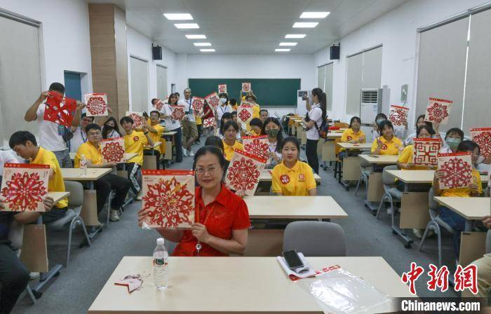 7月12日,台胞青年举起自己亲手制作的中国剪纸,与南宁职业技术学院师生合影留念。杜一航摄