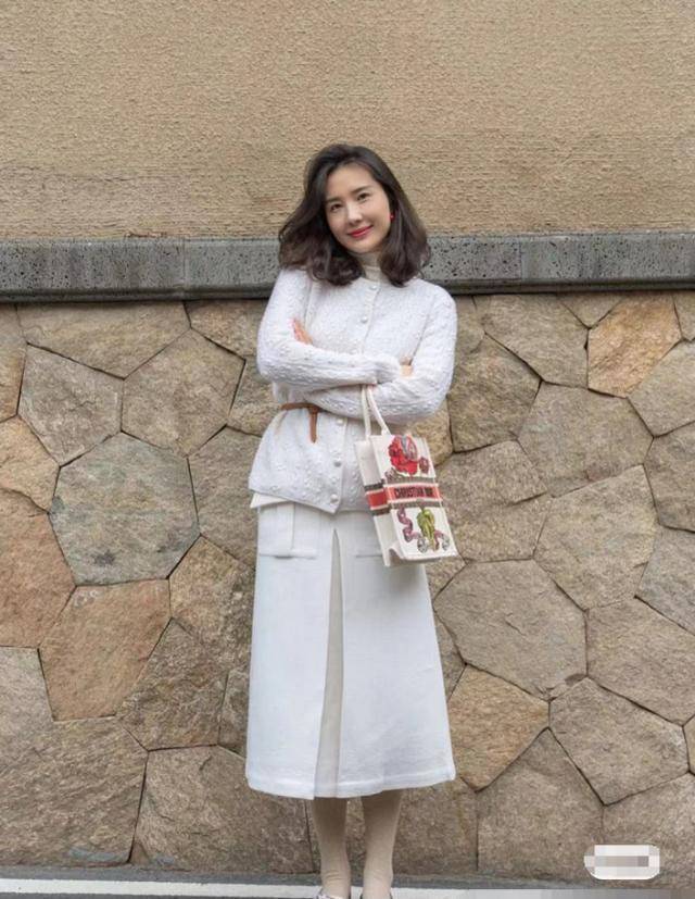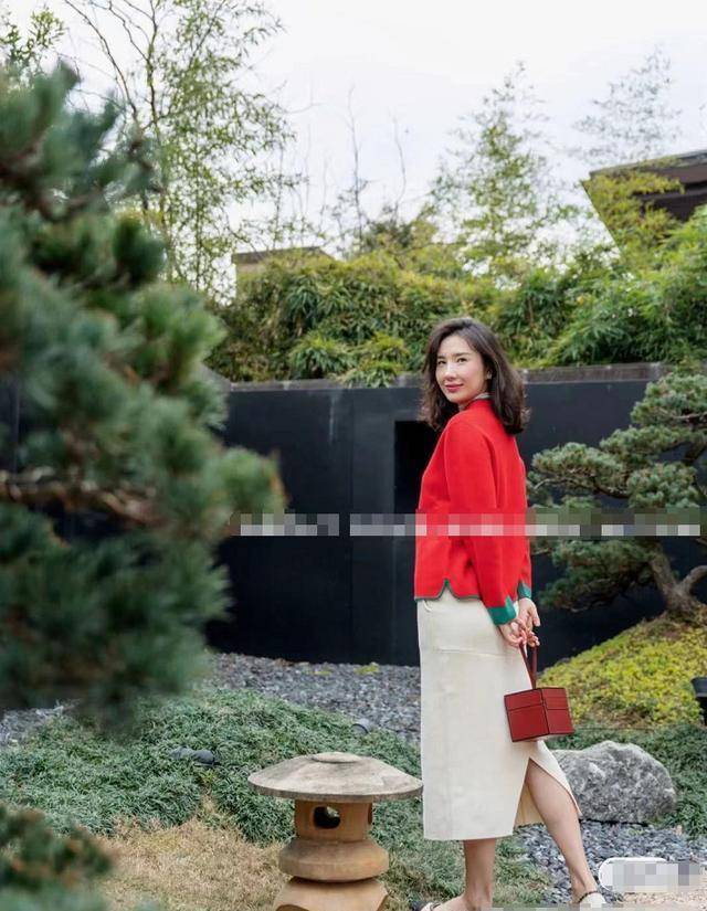 照片中,董花花卷发披肩,身穿红色唐装外套搭配白色毛衫裙,手拎方形包包,一身打扮知性优雅,极具东方美感,喜气洋洋。