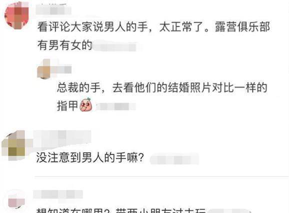 其中,除了注意到董花花无名指上的戒指外,也有放大镜网友注意到在董花花晒出的露营照中有一张男人的照片,虽然只露了一双手,但有网友表示这正是蒋凡的手,对比他们的结婚照指甲一样,不得不说现在的网友真的个个都是侦探。