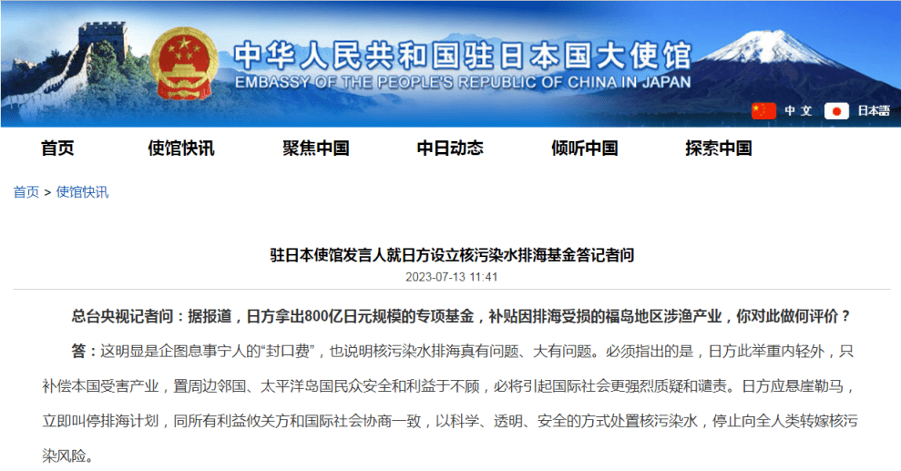原标题:驻日本使馆发言人就日方设立核污染水排海基金答记者问