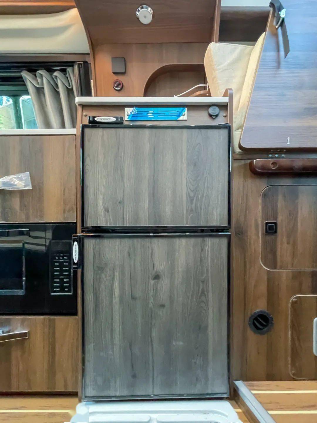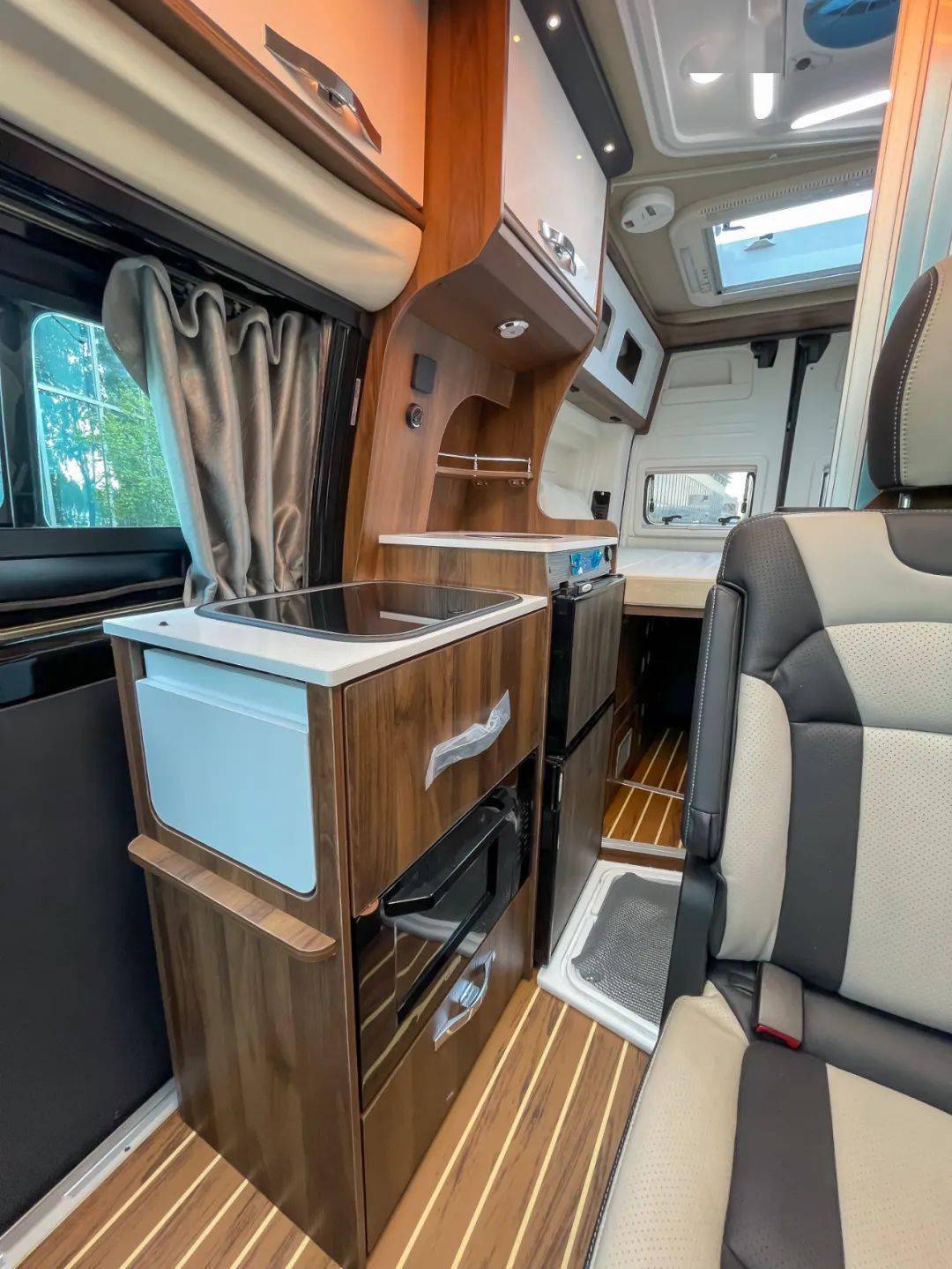 中部为厨卫区,厨房区配置齐全,配备有微波炉、电磁炉、方形带盖水池、拓展桌板等,台面下85L房车专用冰箱能够保证旅居途中食物的新鲜。