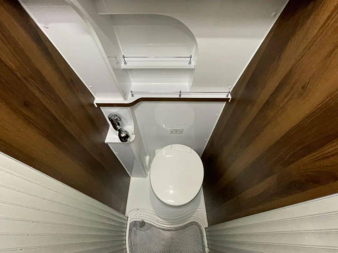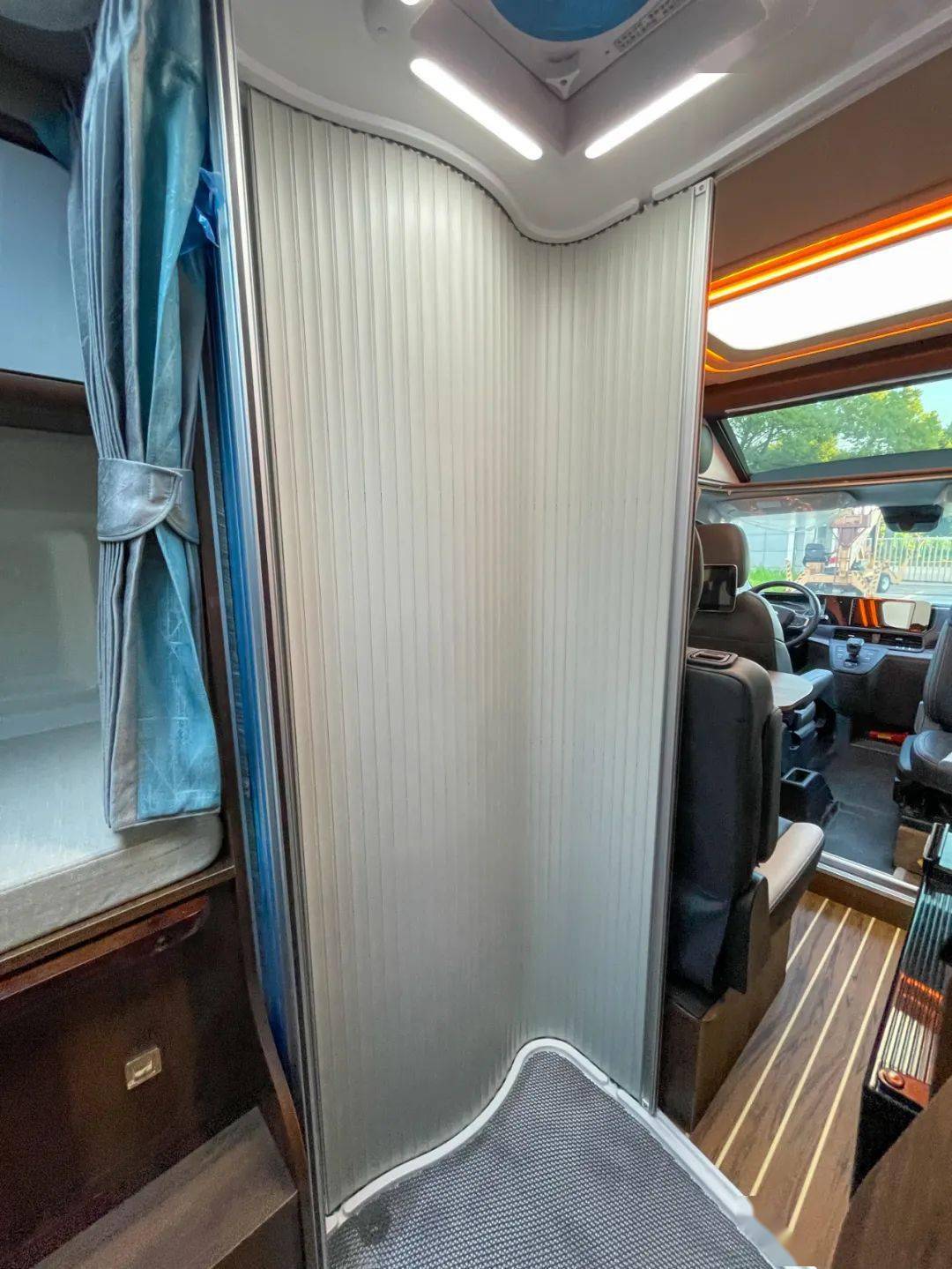 卷帘门式隐藏设计将卫浴设施隐藏在卷帘门后,保持了车内生活空间的整体性,使用时站在其中将卷帘门拉上即可使用,内部配备有环保旋转马桶、多功能豪华卫浴系统 、梳妆镜、置物架、防滑地垫、顶部双向换气扇。