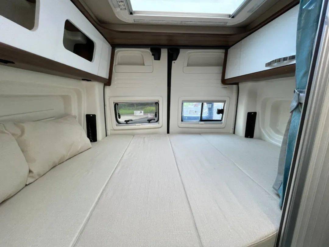 后横床两侧的拓展盲窗带来更宽裕的睡卧空间,床铺的尺寸可达1850×1200mm,后开门上设有两扇窗户,床铺上方装有一个可开启的观景天窗,保证了良好的通风和采光。后双开门可以打开,将床板掀起形成一个前后贯通的通道,平时可以当做储物空间放置大件行李。