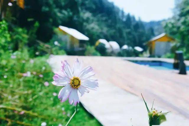 山坡逐渐向上,一小方泳池甚是显眼,几间白色屋顶的帐篷像几颗雨季过后的小蘑菇,从小路两侧长了出来。