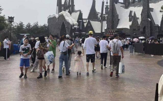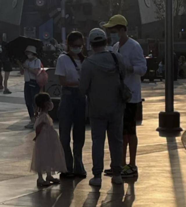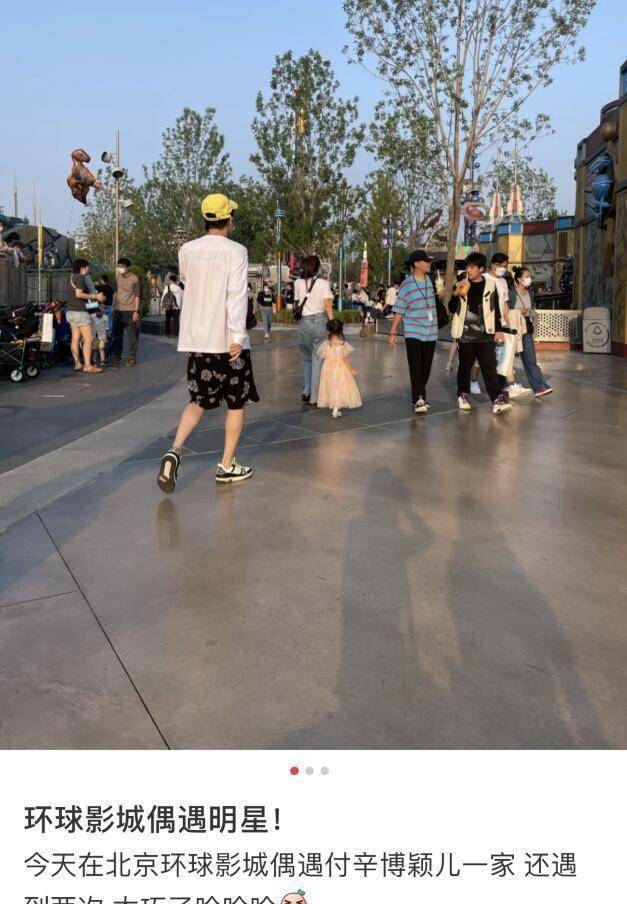 付辛博和颖儿正在和友人聊着什么,小月亮乖巧的站在一旁,看着爸爸妈妈。周围的游客并未上前打扰,他们一家三口就像普通游客一样,在环球影城里游玩。