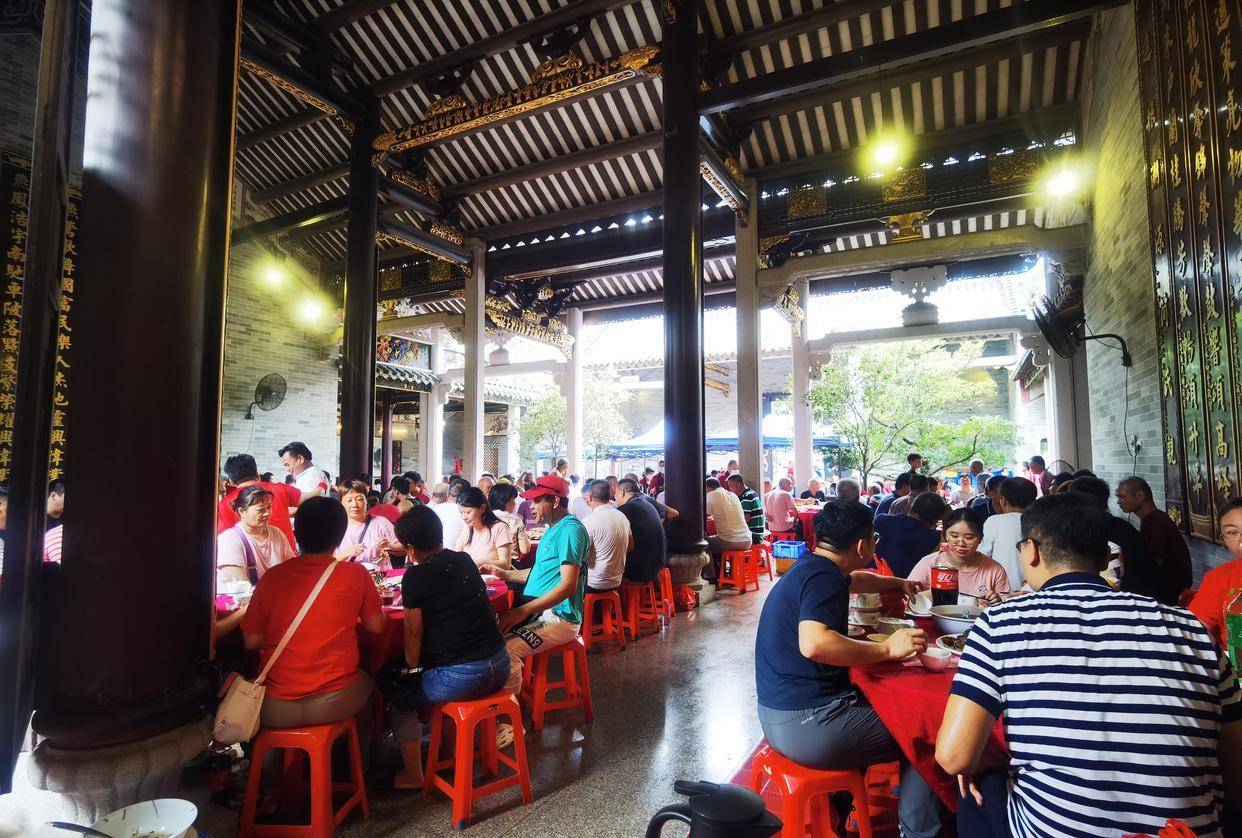 景色中,只见祠堂内外的空地上摆着一张铺着红色桌布的大圆桌。一眼望去,好像有几百张桌子,场面感觉非常宏大。祠堂二门的空地上,厨师和厨工正忙着制作、摊制各种菜肴,十分有气氛。这个传统节日在村里的祠堂前举行,非常有意义。