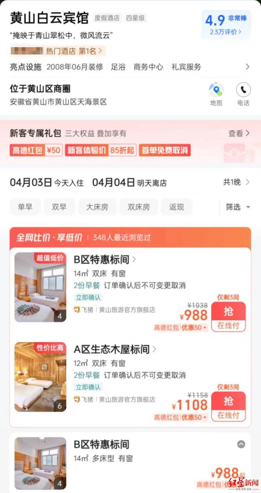 4月3日,红星新闻记者联系到黄山风景区工作人员。对方表示,黄山风景区内的宾馆房价是经物价部门核定的,明码标价,并且通过店堂、网络等公示价格、公开销售,景区内的宾馆有标间和经济房等多种房型,定价也做了细分,游客可以根据需求自主选择,“黄山的宾馆是建在‘肩膀’上的,因为所有建筑材料要运送上山,所有建筑垃圾要运送下山,成本自然比山下宾馆要高很多,所以我们认为这个定价是合理合情的。”