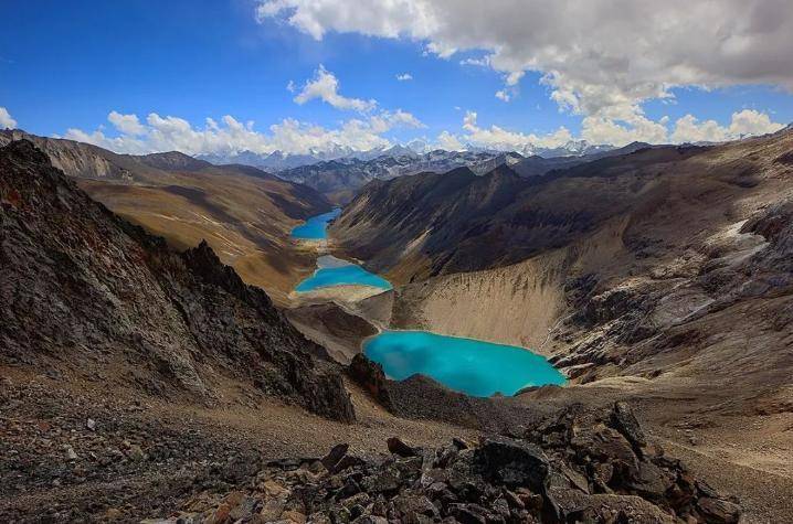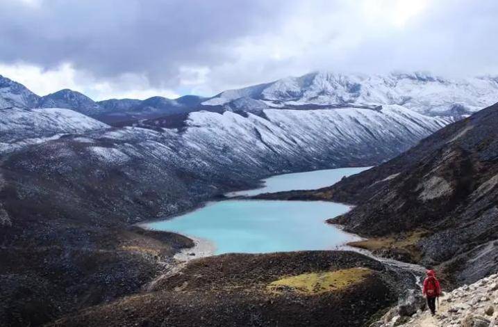 因为当时库拉岗日峰雪峰上的积雪开始融化,冰雪融化形成的清澈泉水流入山谷,形成了许多湖泊。山顶的“姐妹湖”与各脉山峰构成了郁郁葱葱的景象。