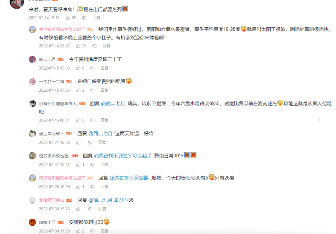 去年贵州今年盛夏平均气温在18.0℃~29.5℃之间(河谷地带、部分地区除外),炎炎夏日,当全国夏季不少城市持续开启40℃以上的“高温烧烤”模式时,贵州值得你清凉一夏。