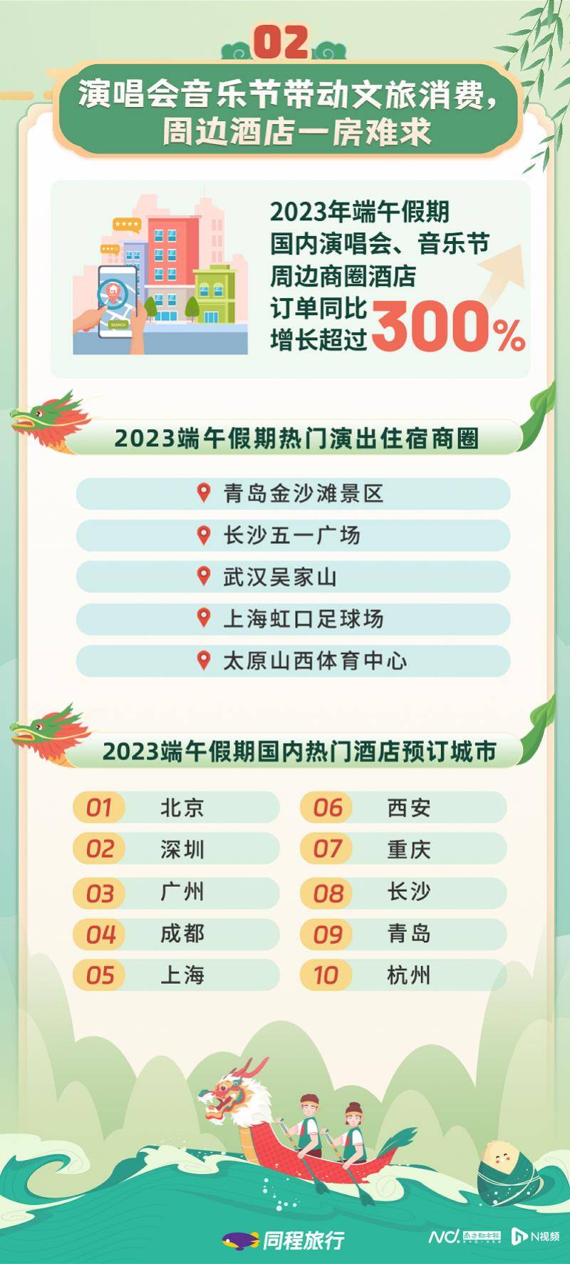 以音乐会、音乐节为代表的潮流文化也成为游客端午节旅游的新目的地。据不完全统计,今年端午节期间将举办数十场全国性音乐会、音乐节等活动,数百场各类音乐表演。数以万计的年轻游客前往一座城市听一场音乐会,开始他们的假期之旅。同程旅游数据显示,2023年端午节期间,国内演唱会、音乐节周边商圈酒店预订量同比增长超300%。