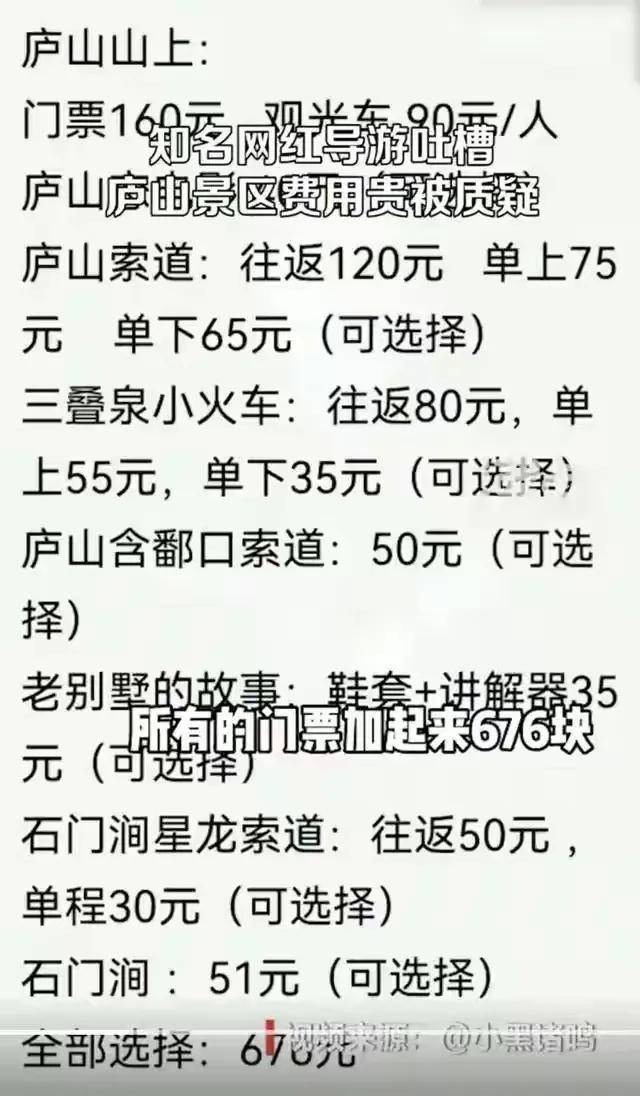 对于庐山景区收费混乱,知名网红导游小黑朱明也发视频抱怨:自己从事旅游行业20多年,也想不通请问游览庐山风景区要花多少钱。小黑朱明列出的庐山核心景区费用为676元,外围景点费用为805元。他认为,庐山风景区不合理的成本不利于旅游业的发展,也损害了游客的权益。他建议庐山景区统一管理,实行一票制,让游客集中游览、多去地方、少买东西。