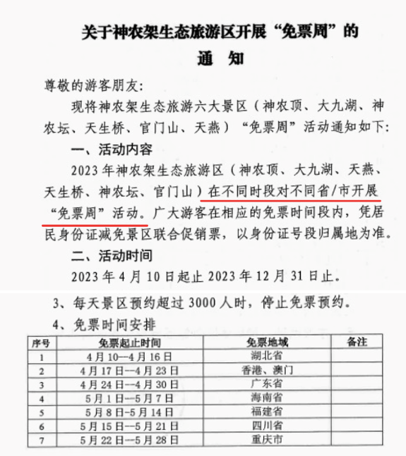 此外,神农架还面向全国游客开展“免票周”活动。从4月10日至12月31日,景区在不同时段对不同省市区开展免票周活动,以身份证号段归属地为准,相应省区居民在对应周段可免门票游览。