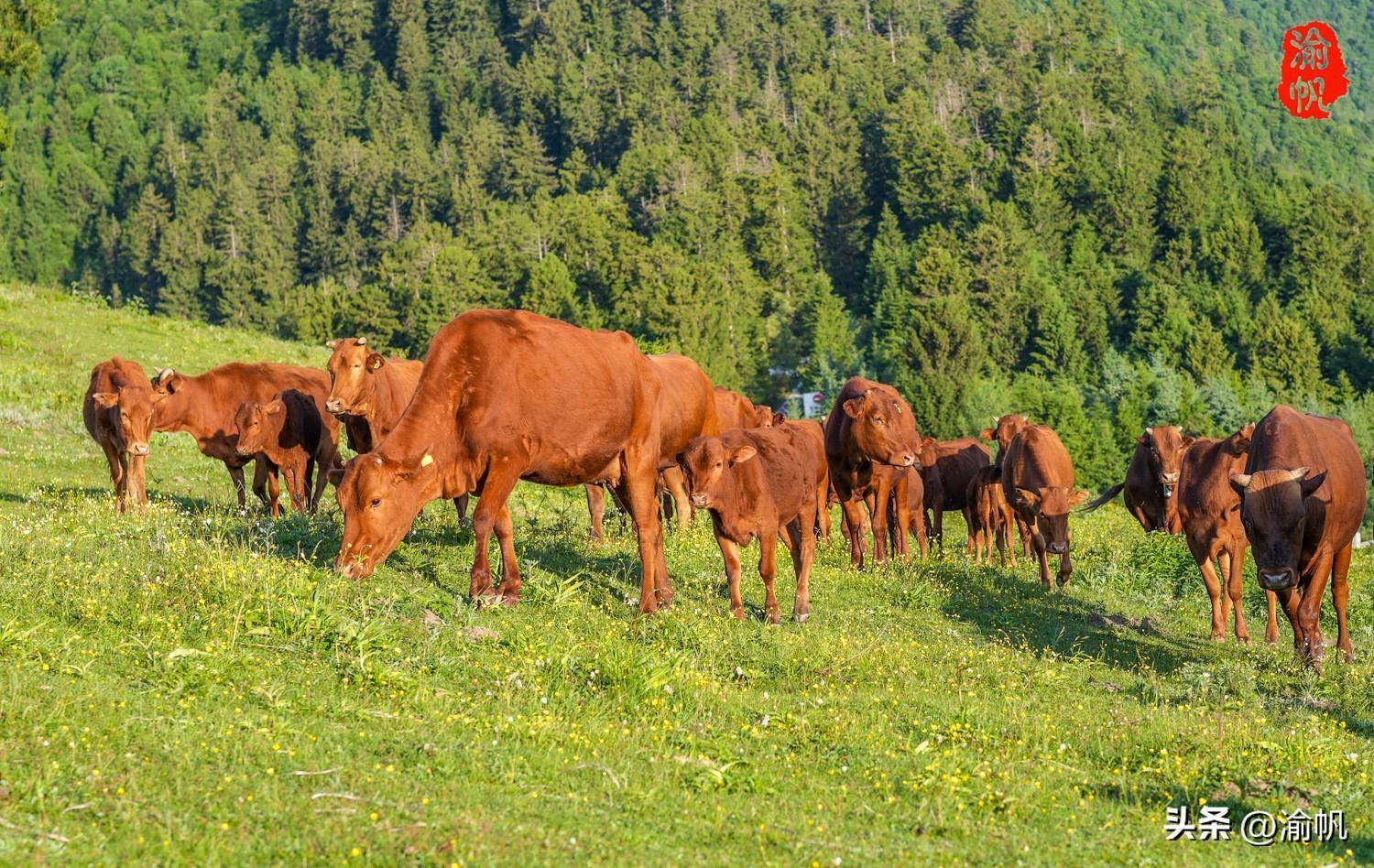 拉嘎山上随时可见成群的牛羊。它们在草原上徜徉,在草地上自由自在地吃草,与周围的牧场、森林、山峰融为一体,美化它们,美丽得像一幅画卷。其实,他们才是这里的主人,我们只是过客。远远地拍拍他们就好了,太近了就不好了,让他们的生活太不舒服了。