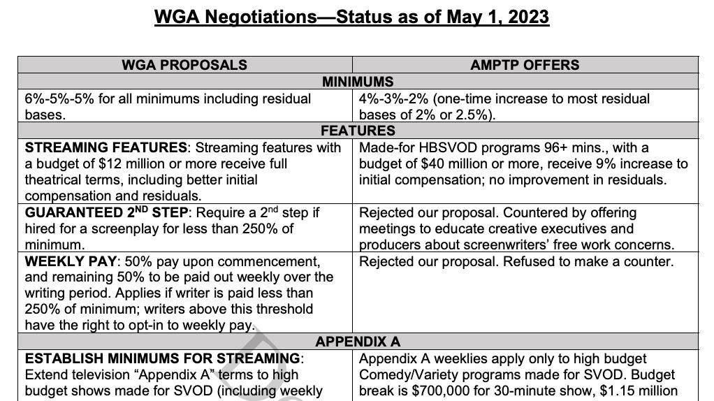5月20日起,美国编剧工会(WGA)和外国电影电视制片人协会(AMPTP)开始就流媒体时代编剧的收入和生存问题进行谈判。WGA目前拥有超过11,500名会员,AMPTP代表350多家影视制作公司的利益,包括Netflix、苹果、迪士尼、NBC环球和派拉蒙。每三年,双方就编剧收入等问题进行协商,并签署新的合作协议。