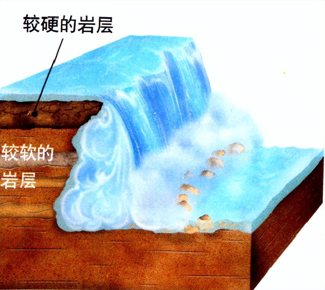 ①河水经过陡坡或悬崖,上游河床岩石坚硬,下游河床岩石松软,河水不断侵蚀下面较软的岩层。②河水逐渐将下部较软的岩层挖空,使上部较硬的岩层悬浮起来。