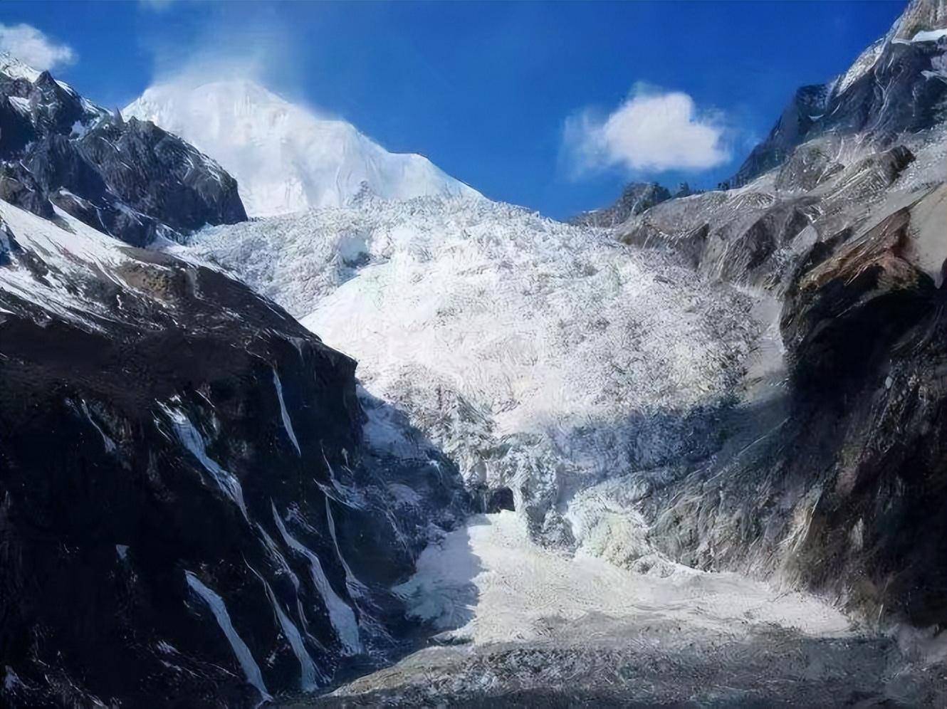 它位于海螺沟冰川的上端,是一座巨大的陡壁。当冰川移动到这里时,它像瀑布一样落下,形成一个巨大的坚固冰坝。大冰瀑布高1080米,宽1100米。它是我国最高、最大的冰瀑布,相当于黄果树瀑布的15倍。这巨大无比坚固的冰瀑布就像一条银河从蓝天流淌而下,矗立在冰川上就像一面刺破长空的巨大银幕。