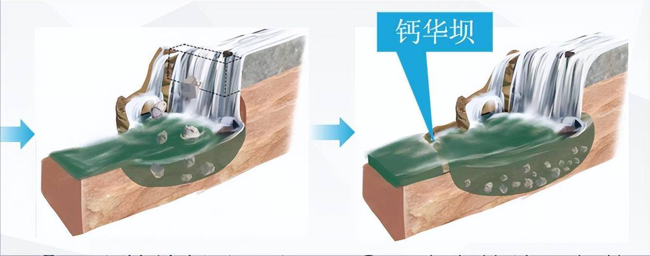 ③河水继续侵蚀,上下岩层侵蚀间隙扩大,悬岩崩塌,瀑布退去。所以瀑布不会一直停留在一处,它会一直向上游移动。④岩石在连续反复的差异性侵蚀和崩塌中变得越来越平缓,岩溶瀑布沿河床会产生独特的钙华沉积物。