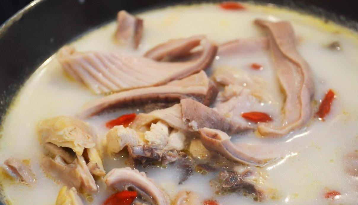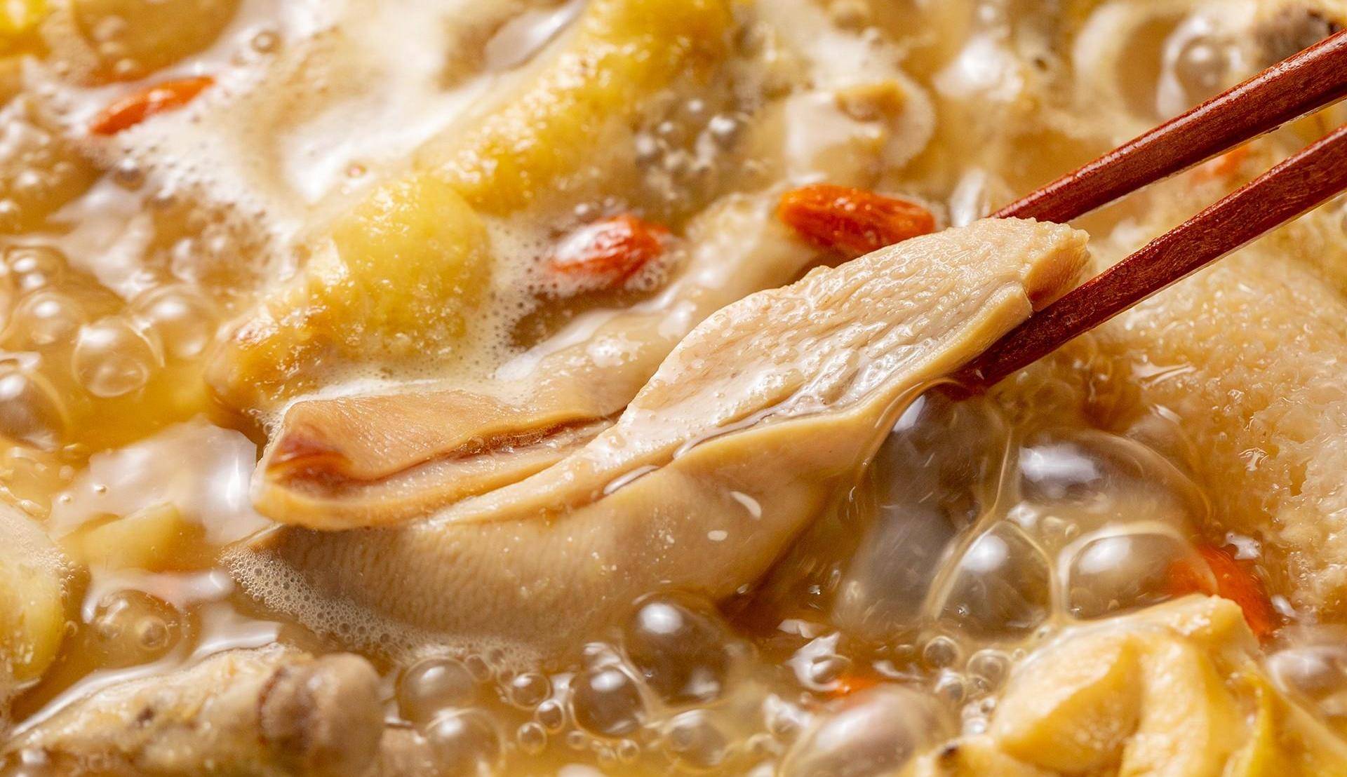 这道十分滋补的猪肚鸡,吃法也很讲究:首先饮原汁原味的猪肚包鸡汤;接着将猪肚包鸡斩件后放入汤中继续煲5~10分钟,吃猪肚和鸡肉,猪肚爽口异常,鸡肉鲜嫩可口。
