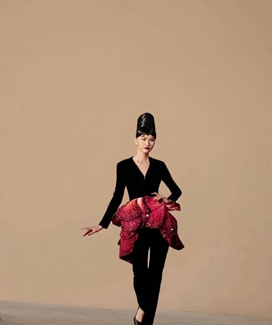 至于图中的艺术品,服装的高级感也很明显。这个发型真的很适合这件衣服和这个模特。问题还出在化妆上。这样的眉毛不适合这套穿搭,这样的眼妆也不适合。对于这套服装,陈采尼本身就是一位时尚彩妆博主,但是为什么他的高定秀没有那么高级,但是为什么高定秀的妆容不合适呢?