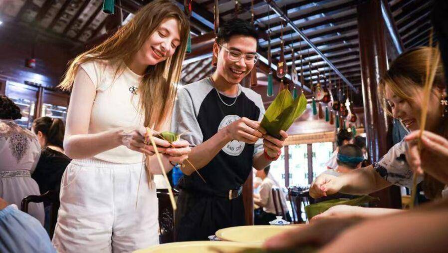 上海各大学的留学生齐聚朱家角煮粽子。海沙尔摄