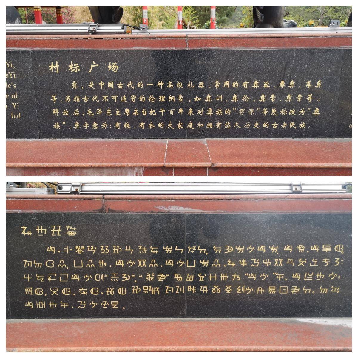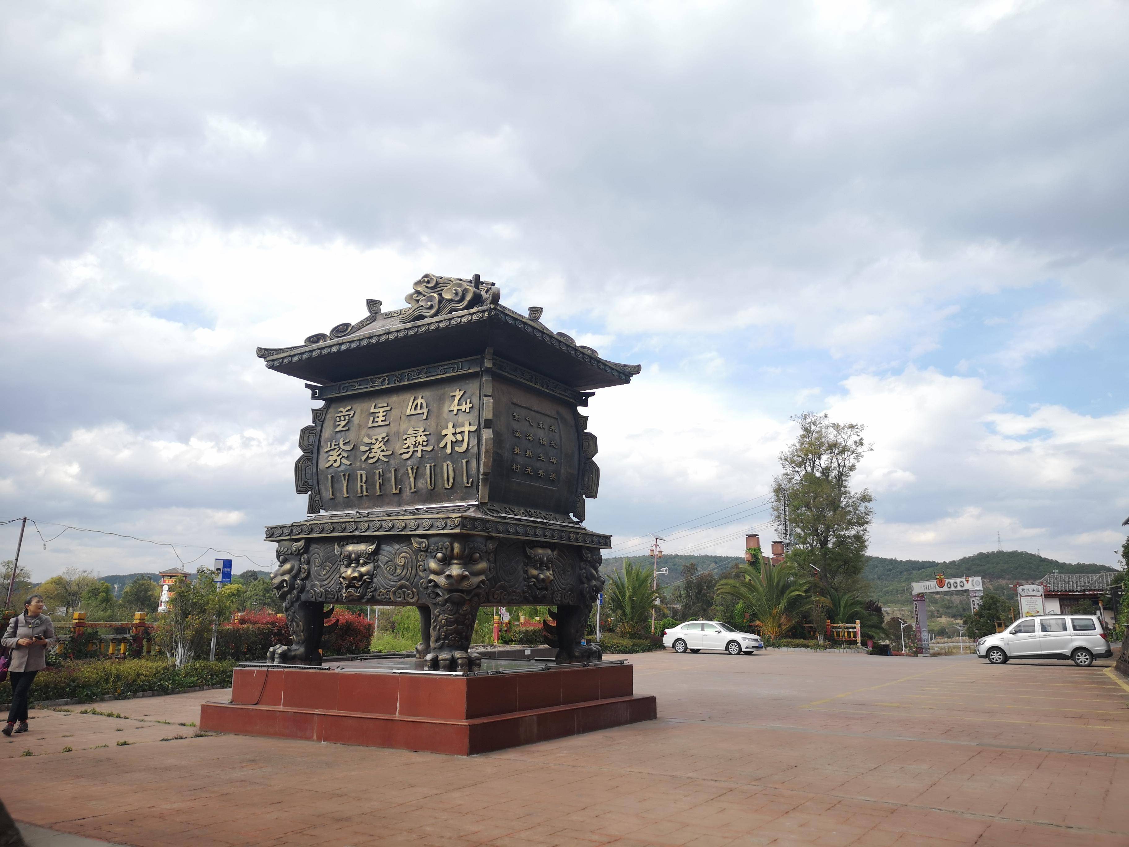 紫溪彝族村村徽广场。巨大的鼎乙上刻有彝文和汉字“紫溪彝村”四个大字。鼎彝下方的底座还用彝文和汉字写着,毛主席给彝族人民赐予了“彝”字。摇晃。