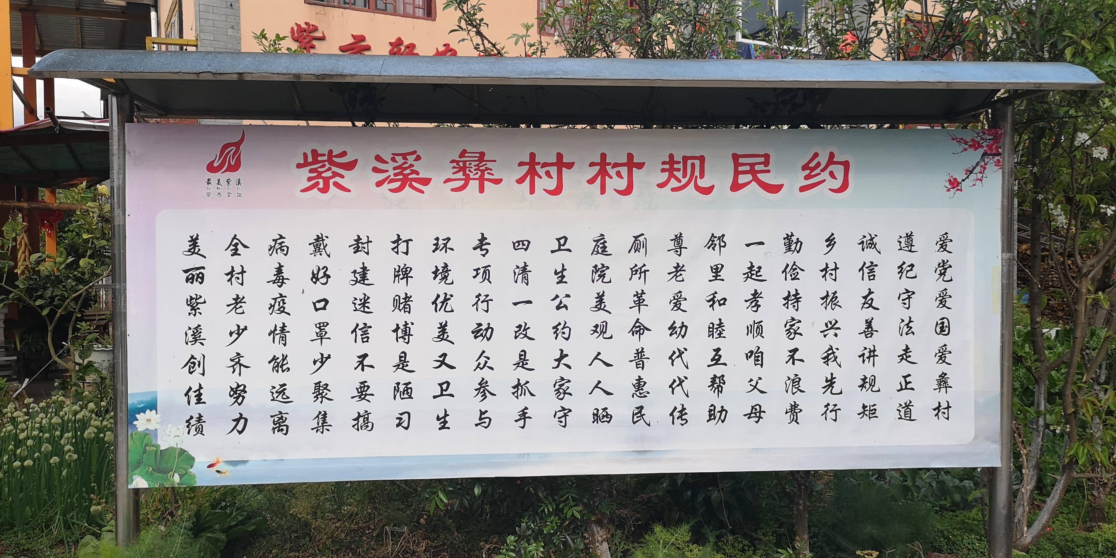 我们首先来到了紫溪一村。紫溪彝族村,位于楚雄市紫溪镇紫溪山麓,是一个新建的村庄。它是为了支持水库建设而搬到这里的。现为云南最典型的彝族旅游村,被誉为“云南美丽乡村”、“我们彝族第一村”。走进村子,映入眼帘的是青山绿树之间一座座两层小楼。整齐漂亮的房屋、平坦宽阔的村道、浓郁的文化墙和具有浓郁民族特色的村广场……让人惊叹不已。萦绕。