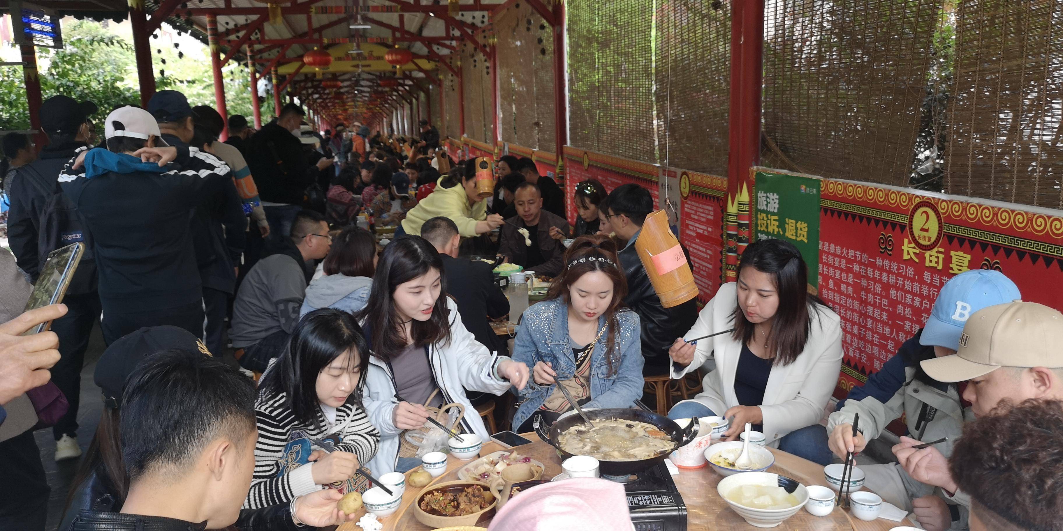 长街宴是彝族庆祝火炬的传统方式。每逢节日,彝族人民都会在村里摆宴席,共同庆祝节日。今年风调雨顺,五谷丰登,人畜平安。