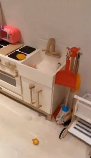 在小型商店后面,还有一个迷你厨房,扫帚、洗手台、橱柜、炉子、烤箱应有尽有,给孩子们模拟做饭做菜玩。