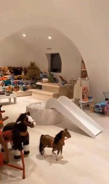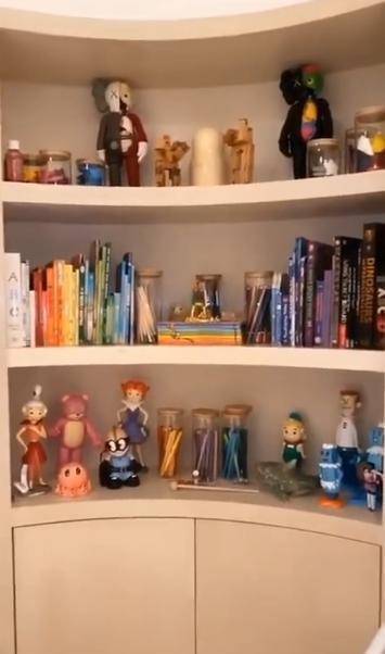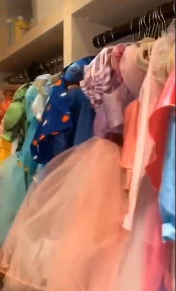 随后卡戴珊走出房间,大家还以为这就结束了,结果卡戴珊居然又走进了一个新的房间,里面两边都是高高的柜子,上面摆着满满的收纳箱,整理的非常整齐干净。里面有各类蜡笔印章等绘画用品,还有专门用来放孩子们特殊装扮的衣柜,孩子们可以随时随地穿上夸张的公主裙扮成公主或者小魔女等角色,箱子里还有各类羽毛头饰,王冠等首饰,抽屉里则放着各类颜色鲜艳的闪亮的公主鞋和贴纸。