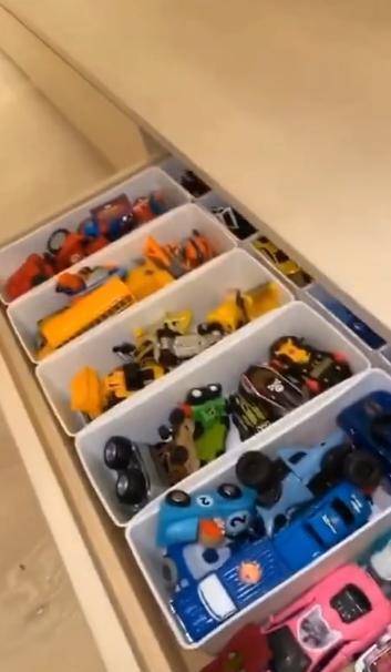 继续往左走就来到了刚刚看到的4层玩具柜,柜子上摆着各类玩具车,有货车,跑车,救护车,大大小小的样式都有,还有各种恐龙玩具。下面的抽屉里也是放的满满的,有各种拼组的乐高玩具,积木,还有小汽车。