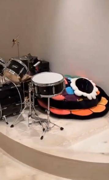 镜头转向右方,可以看到右边居然还有小型舞台,上面放着完整的架子鼓乐器装备,后面还有海绵垫子给孩子们坐和玩。