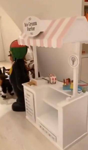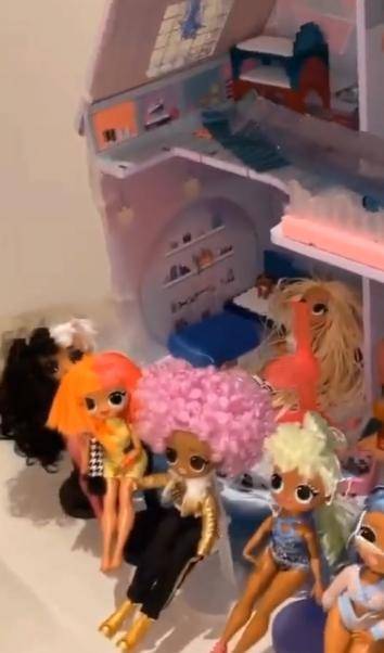 镜头往前移动,来到了一处娃娃区,放着各种芭比娃娃,还有一个有半人高的芭比娃娃的房子,里面放着迷你婴儿车,小桌子等各类过家家的玩具。