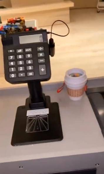 更夸张的就是,玩具房里还有一个迷你商店,里面有小摊贩的货柜,还有一个可以感应的收银台,可以输入数字,上次孩子们玩完之后还没有收拾过,上面有各类玩具厨具。旁边还有闪闪亮亮的迷你购物车。