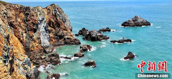 7月13日,福建省宁德市霞浦县海岛乡四礵列岛之东礵岛的美丽风光,吸引一批批游客纷至沓来。图为东礵岛怪石嶙峋,海鸟翱翔在悬崖峭壁间。立言 摄