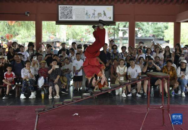 7月13日,游客在开封市清明上河园景区内观赏杂技表演。