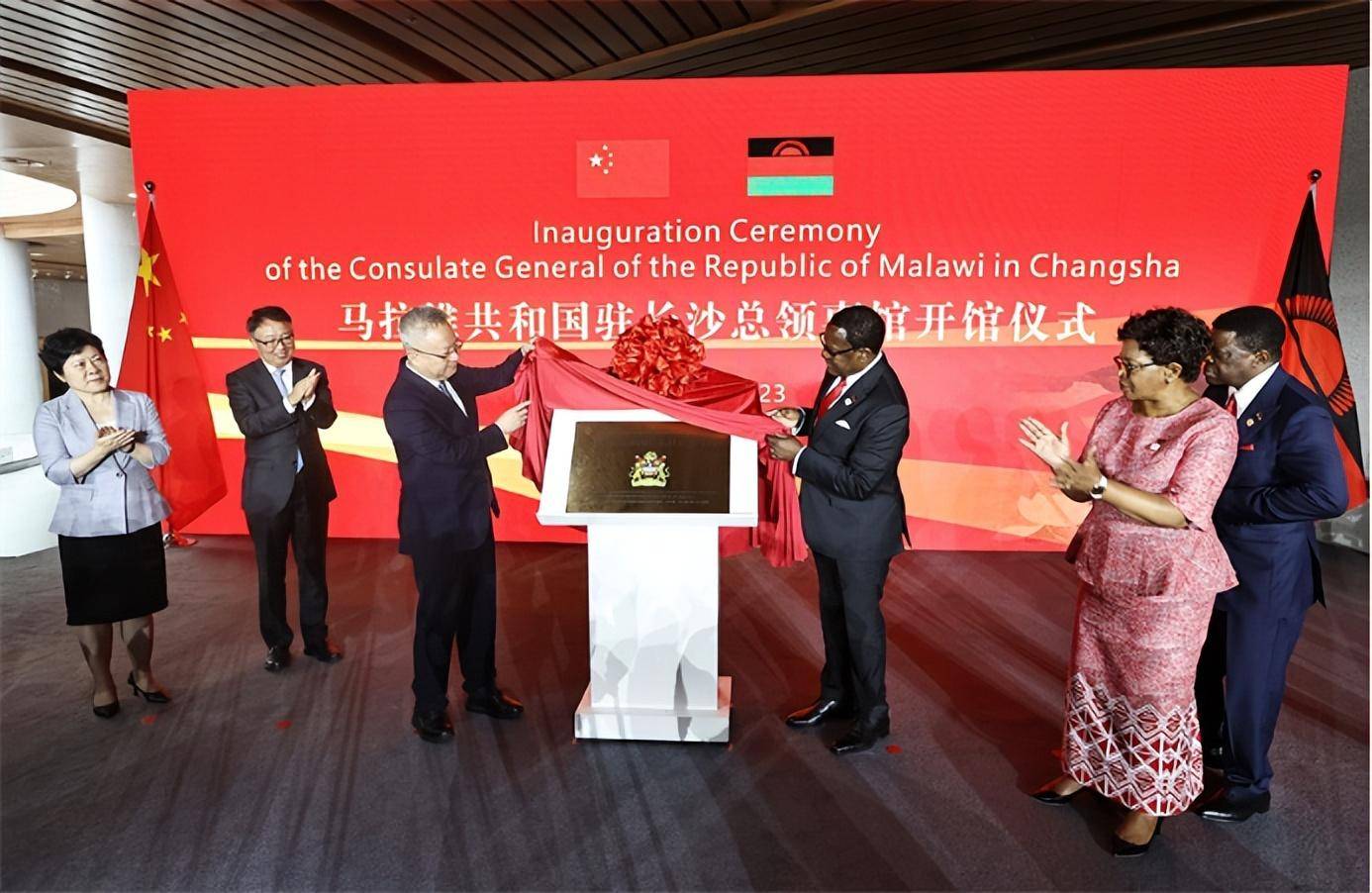 6月29日,马拉维共和国驻长沙总领事馆开馆仪式,马拉维总统查克维拉、湖南省委书记沈晓明为总领事馆揭牌