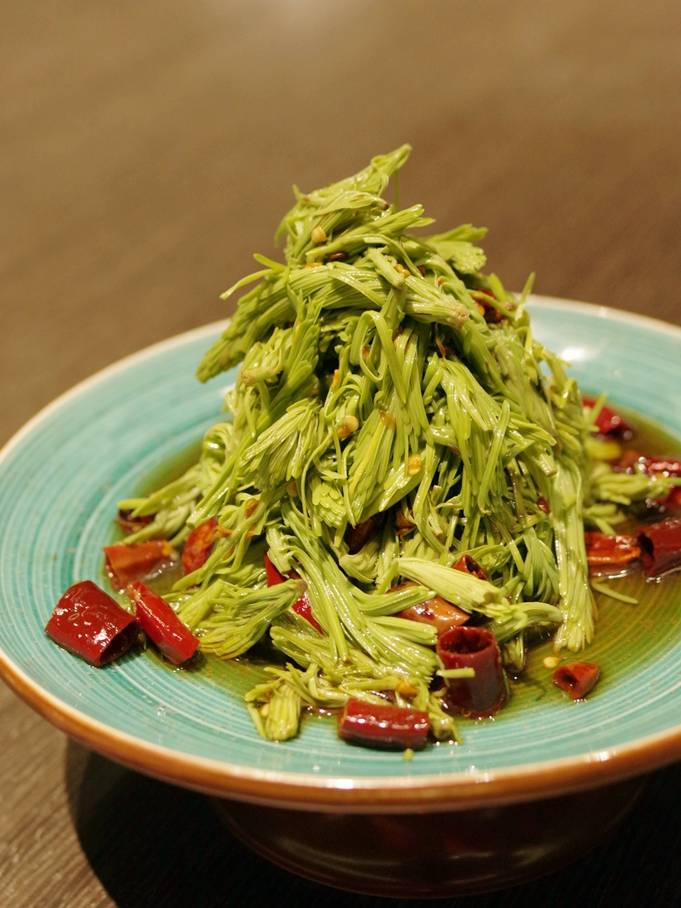 有个小菜好像是松叶的嫩芽,这个以前没吃过。服务员介绍用的是东北的食材,做法温油呛拌,算是尝鲜开眼界啦;其实我觉得不好吃,口感老韧,不如常见的蕨菜或者不常见的刺嫩芽。