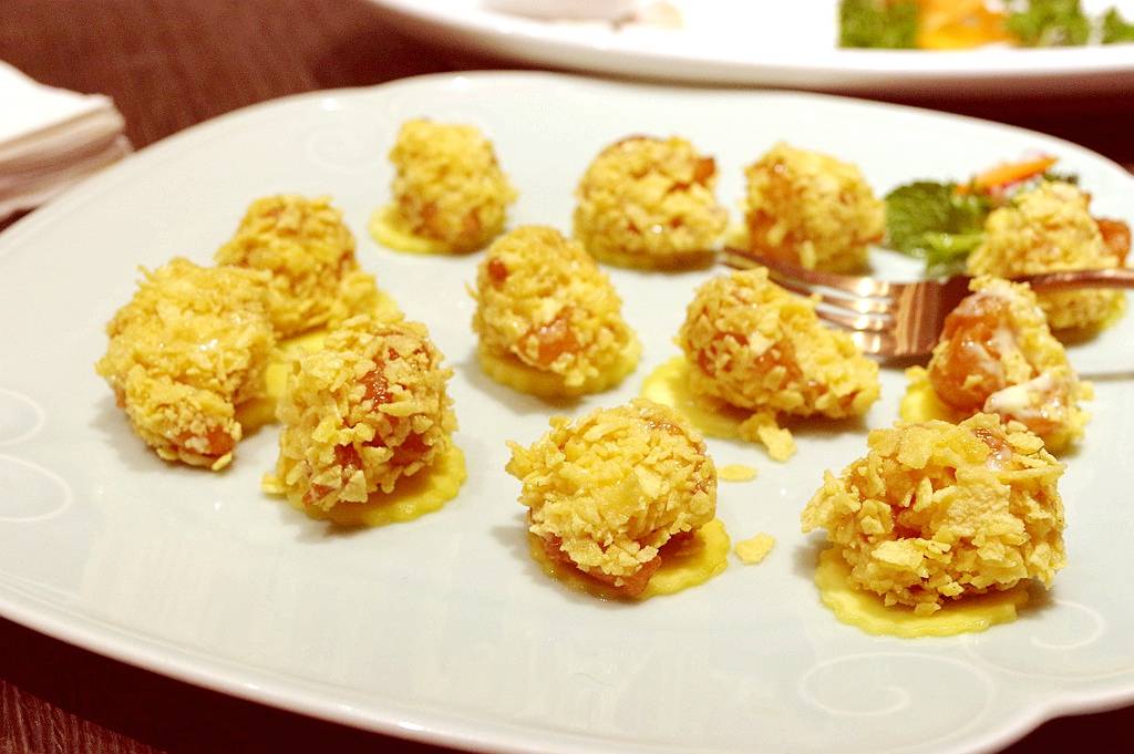 炸过的虾球蘸沙拉酱再裹面包糠杏仁片复炸的手法,西式风格我不喜欢,也许孩子们或女士会更青睐这种吃法。