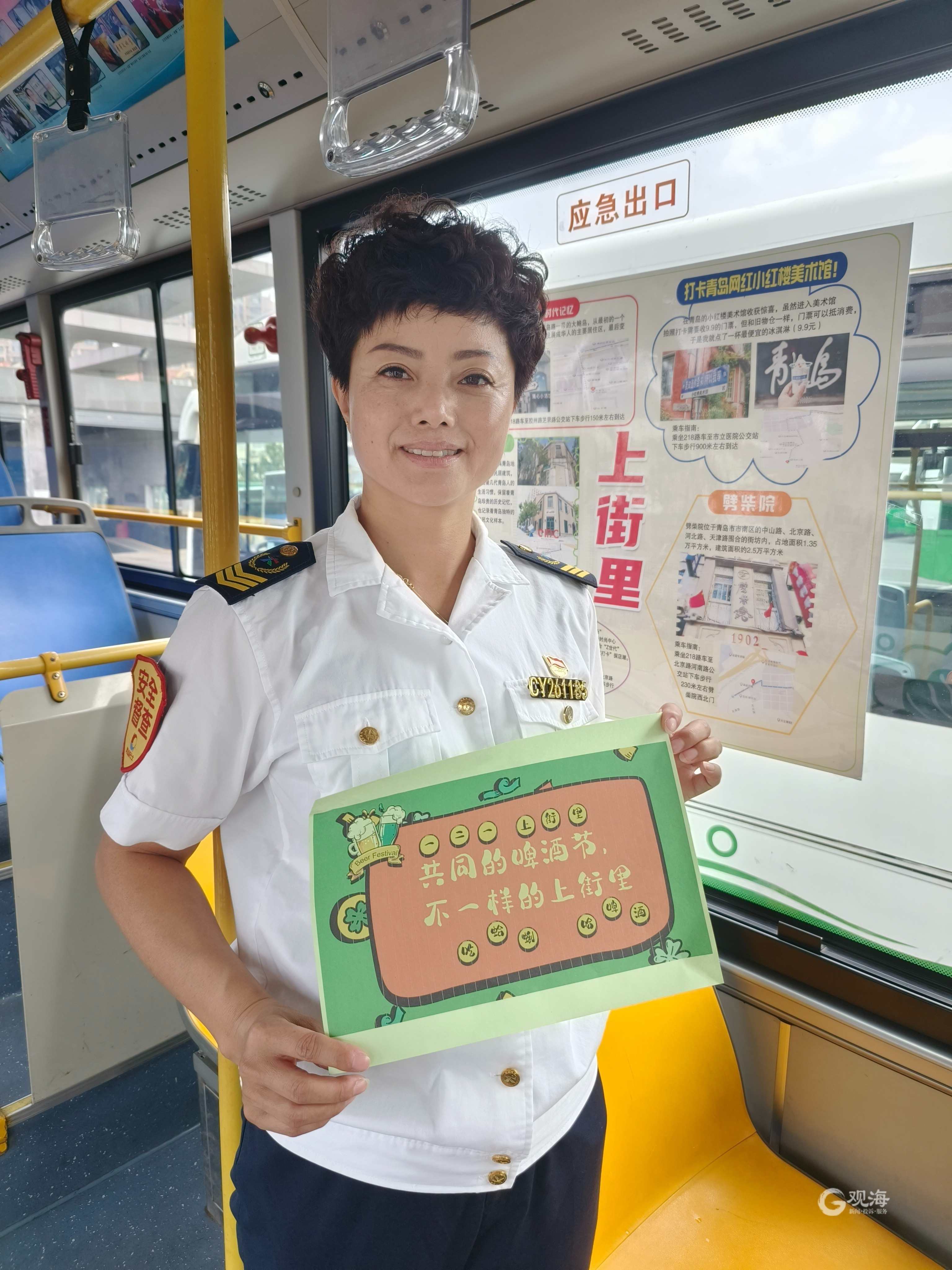 为使市民游客切实感受到青岛公交贴心服务,公交隧道巴士218路线驾驶员袁丽特意打造了“上街里·啤酒节”打卡指南,向乘客详细介绍了“吃蛤蜊、哈啤酒”的乘车攻略。袁丽在车厢内还配备一次性雨衣、青岛地图等便民措施,为游客们的出行保驾护航。同时,“青岛巴士”志愿者们将在台东一路东光路、台东、胶州路芝罘路车站等主要站点疏导客流,为游客提供节日咨询服务。