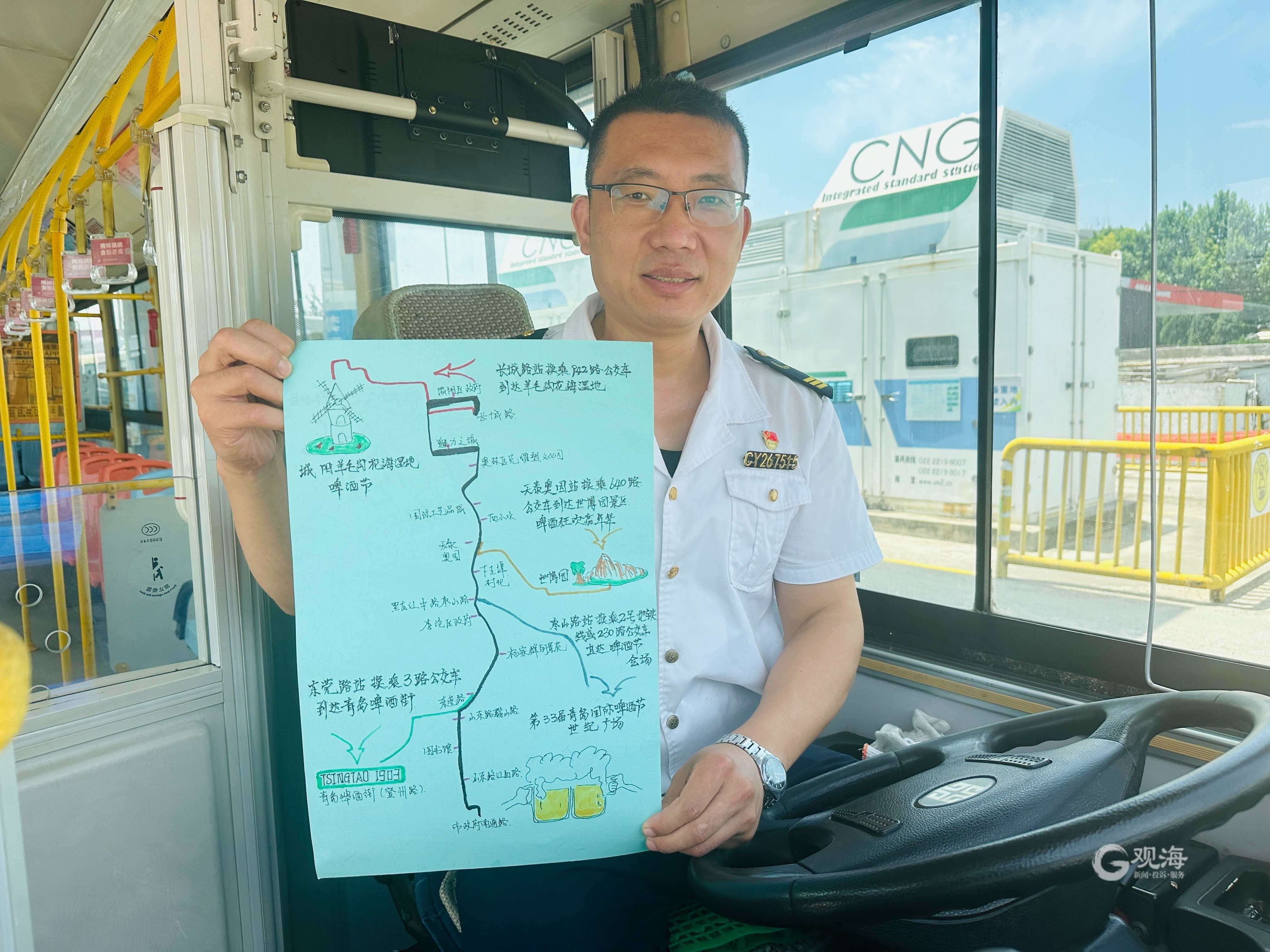 城阳巴士502路驾驶员李波制作了“502路换乘地铁小卡片(啤酒节版)”,上面用地图样式详细描绘标注了乘坐502路在“黑龙江中路枣山路站”下车,到“枣山路”站换乘地铁2号线至“石老人浴场”站B2口出地铁后,步行前往啤酒节崂山区世纪广场会场。李波表示:“啤酒节是青岛一件盛事,是对外展示城市形象的重要机会,我作为一名公交车司机,一定要以更加优质的服务来擦亮文明的窗口。”