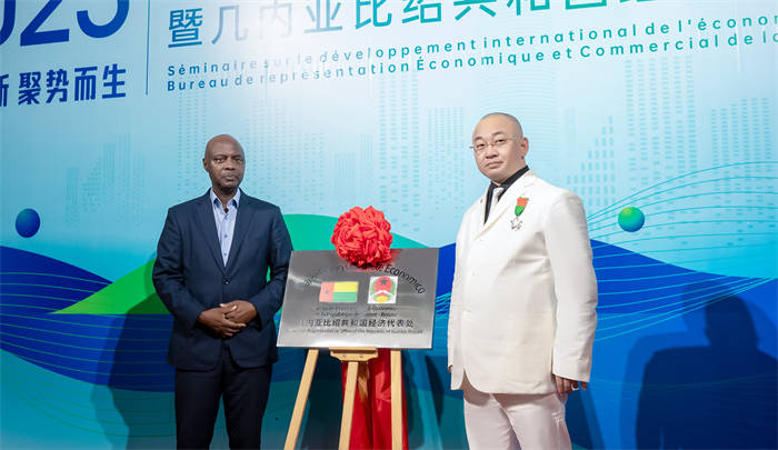 几内亚比绍驻华公使衔参赞莫吉塔·伽洛、李玉保主席上台共同为几内亚比绍共和国经济代表处揭牌。此前为表彰李玉保主席对促进几内亚比绍经济、投资及商贸等方面发展作出的重大贡献,几内亚比绍驻华大使馆聘任李玉保主席为“几内亚比绍共和国经济-经贸办事处首席代表”。随着几内亚比绍共和国经济代表处的正式成立,两国将进一步加强合作与交流,实现互利共赢。