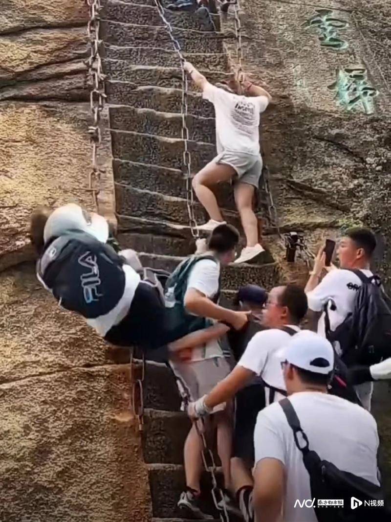 事实上,景区云梯旁边就有警示牌,上面的文字提醒游客,高血压、上肢无力等特殊情况的游客,从旁边平缓一点的辅道上山。每个人的身体条件,登山的经验等,都会影响他的体验,有的人哪怕是爬难度不高的山,都会面临体力问题,甚至身体会出现突发状况。显然,景区在运营过程中需要和游客做好沟通,对于突发情况的应对,对于游客安全的保障,都要有一套规范的操作。