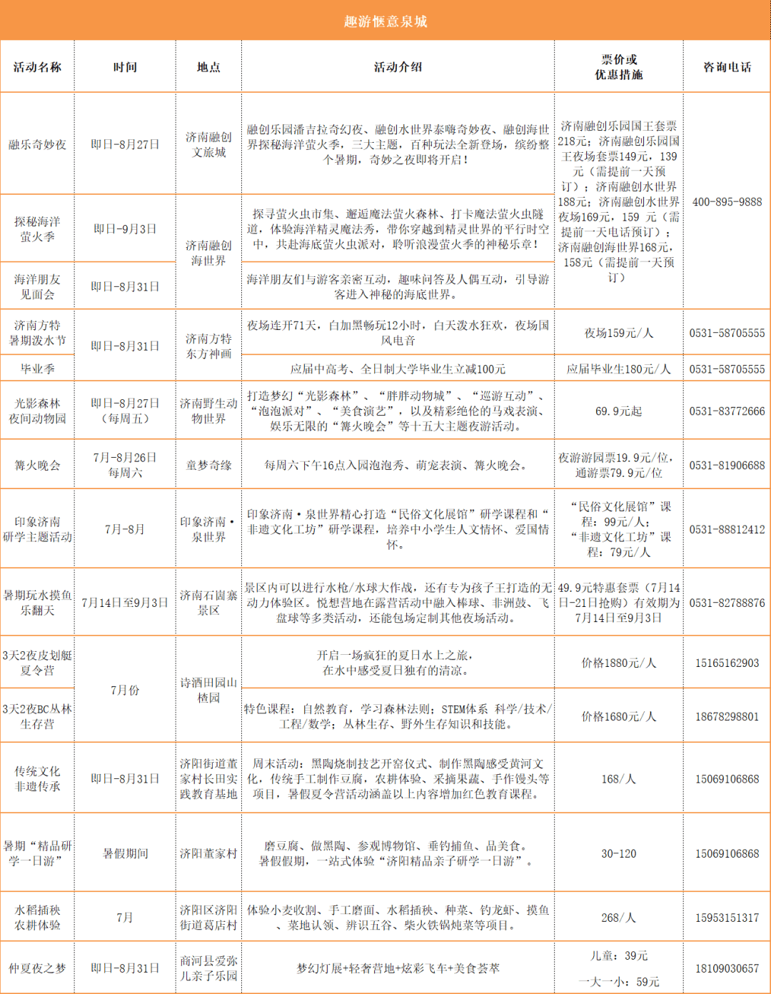 为进一步丰富泉城市民夏日精神文化生活,特别是为青少年暑期提供丰富多彩的公共文化艺术活动,促进新时代青少年美育发展,市文化和旅游局组织开展“泉城暑期文化艺术服务季”活动,时间为7月-8月。