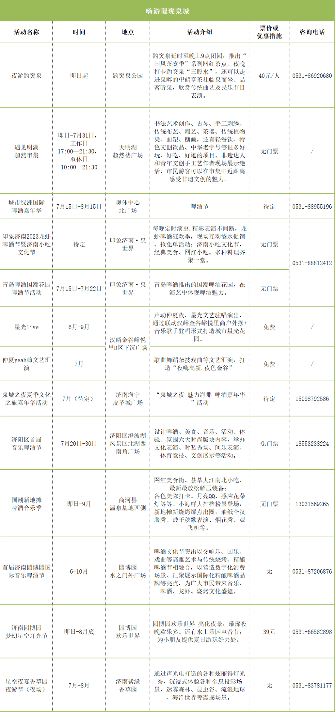 7月14日,大众网记者从济南市文化和旅游局获悉,市文化和旅游局将以“2023盛夏泉城狂欢季”为主题,组织区县文旅部门和企业,发挥文旅资源优势,聚焦暑期文旅消费热点需求,策划推出潮流夜场狂欢、避暑山野狂欢、快乐亲子狂欢、花样乡村狂欢、文艺演出狂欢、艺术展览狂欢等300多项文化旅游活动。