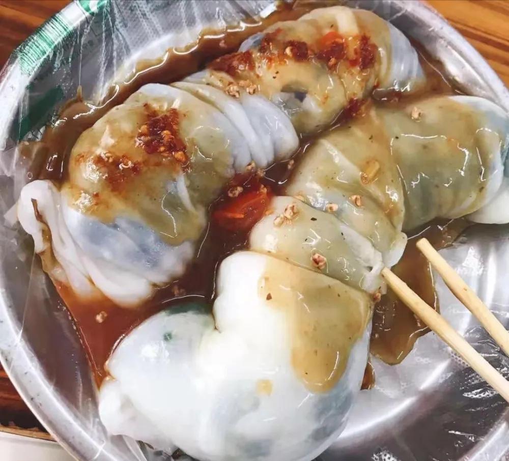 米浆蒸熟摊平在竹板上,撒肉末、萝卜、葱花等馅料,一卷一合,一条卷筒粉就做好了。再配上特有的黄皮酱,绝对独领风骚。