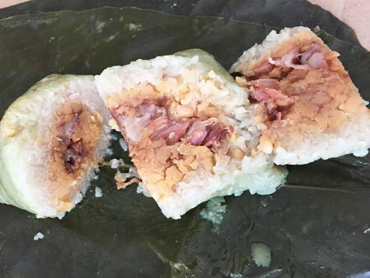 南宁粽子个头很大,包成枕头粽形状。通常在糯米里会包上五花肉、绿豆,猪肉的肥润加上清甜的绿豆,这样独特的搭配吃起来反而口味清新,膏腴不腻。