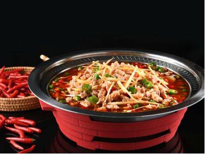 放眼整个四川,水煮肉片都是相当炸裂的存在。有红鸡毛店在炒制这道菜时,会取里脊肉,配豆芽、青菜等,荤素搭配,热油一浇,肉片和辣椒香气四溢,红油包裹着,辣味十足,吃完浑身都是暖和的。
