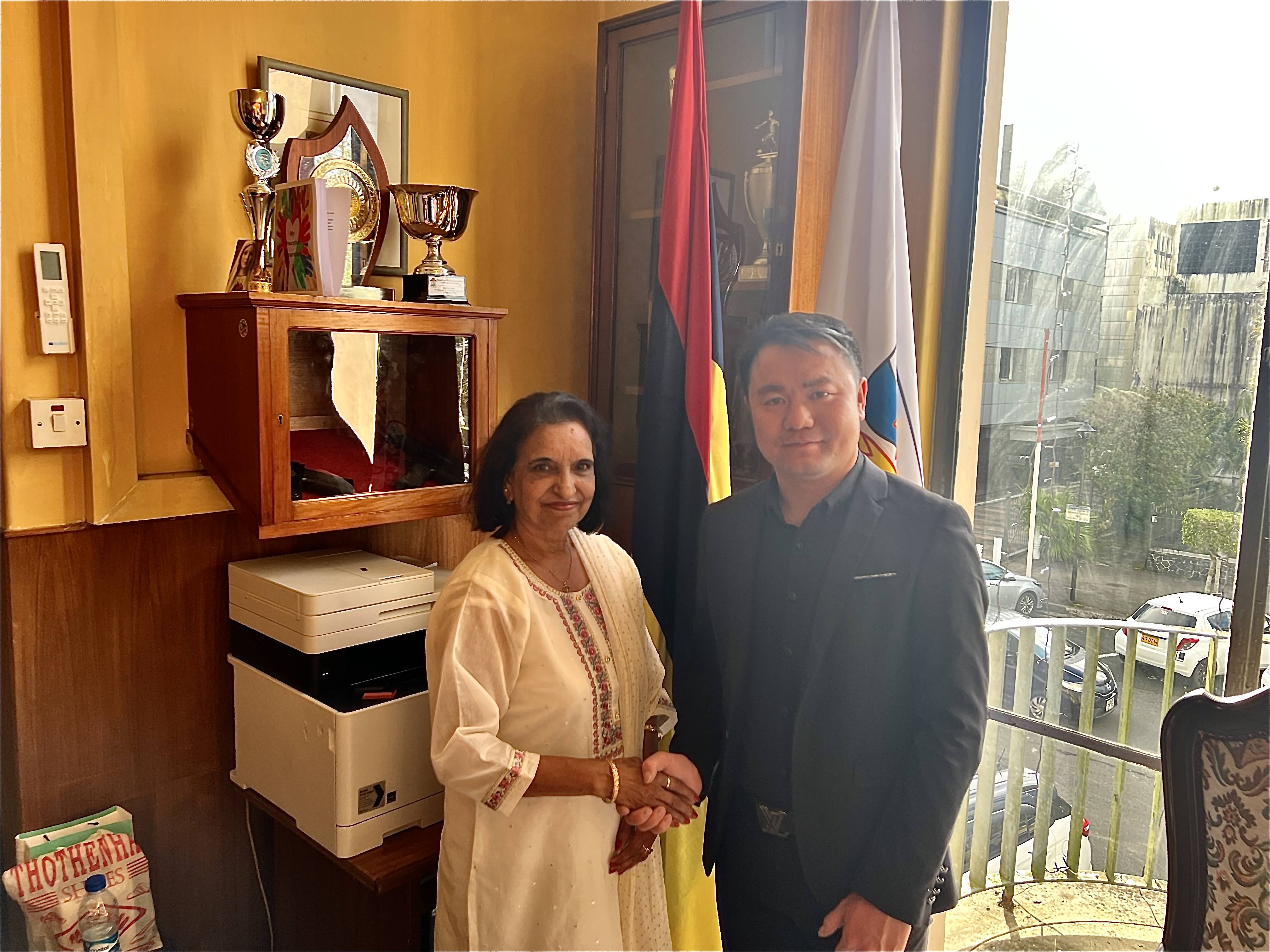 今日,毛里求斯中国和平统一促进会会长、毛里求斯唐人街基金会会长、梅州籍青年侨领林海岩,毛里求斯中华文化艺术委员会主席林最宏,中国文艺志愿者、梅州市民间文艺家协会副会长、客家三宝组合创始人陈善宝在毛里求斯鸠比市市政厅接受市长Devika Pabaroo (德维卡•帕巴鲁)、副市长Chellen Samy(谢伦•萨米)等亲切接见。