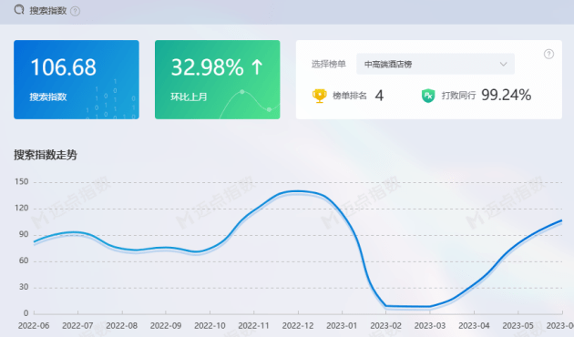 近日,迈点研究院发布《2023年6月中国酒店业发展报告》,报告显示,在搜索指数前十排行榜中有3家酒店新晋上榜,其中包括朗丽兹酒店。6月,朗丽兹酒店的搜索指数为106.8,环比5月上涨32.98%。迈点表示,搜索指数代表市场对品牌的主动搜索和关注,搜索指数越高,代表市场关注度越高。