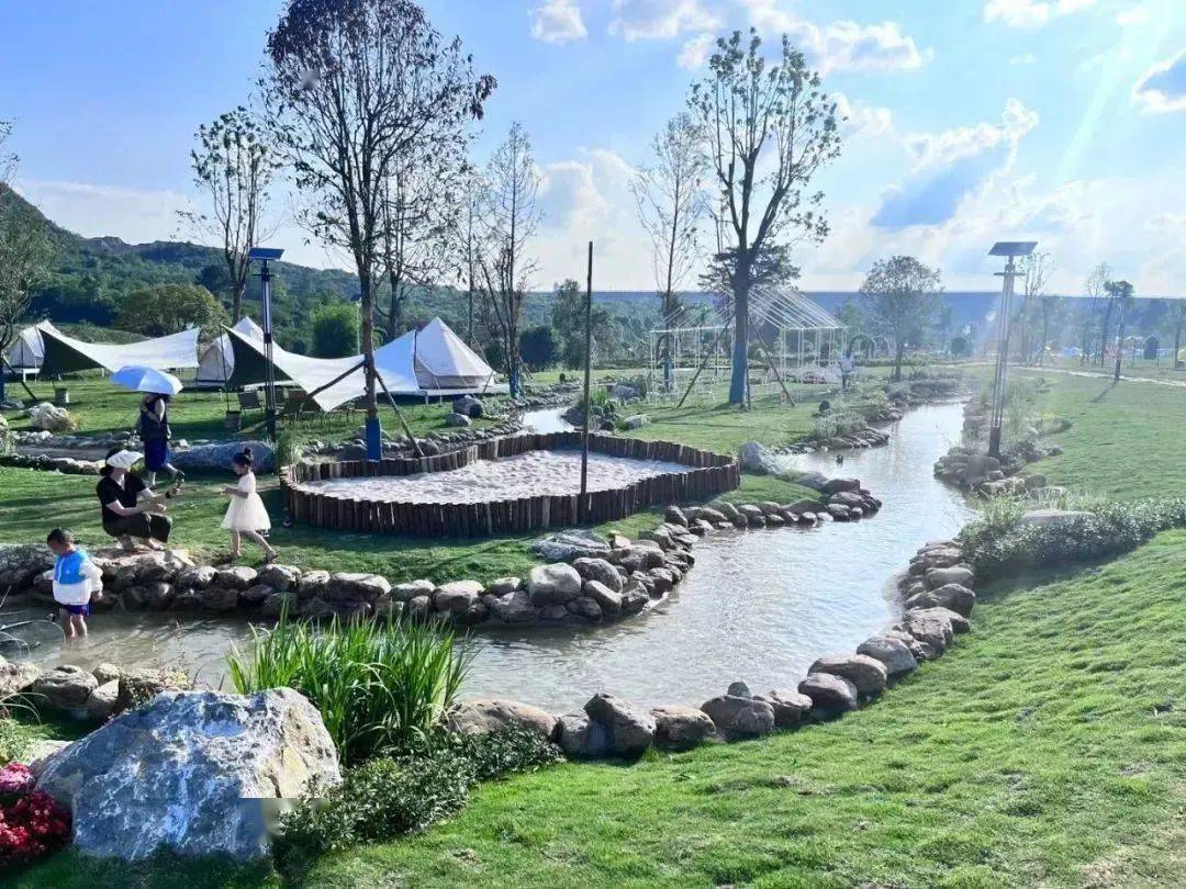 清澈的穿洞河水从基地一侧漫淌而过;溪水山边鸟鸣声不绝;一顶顶精致的帐篷散落在松软的草地上……在宛如灵动山水画卷的基地里露营,感受大自然的清新。